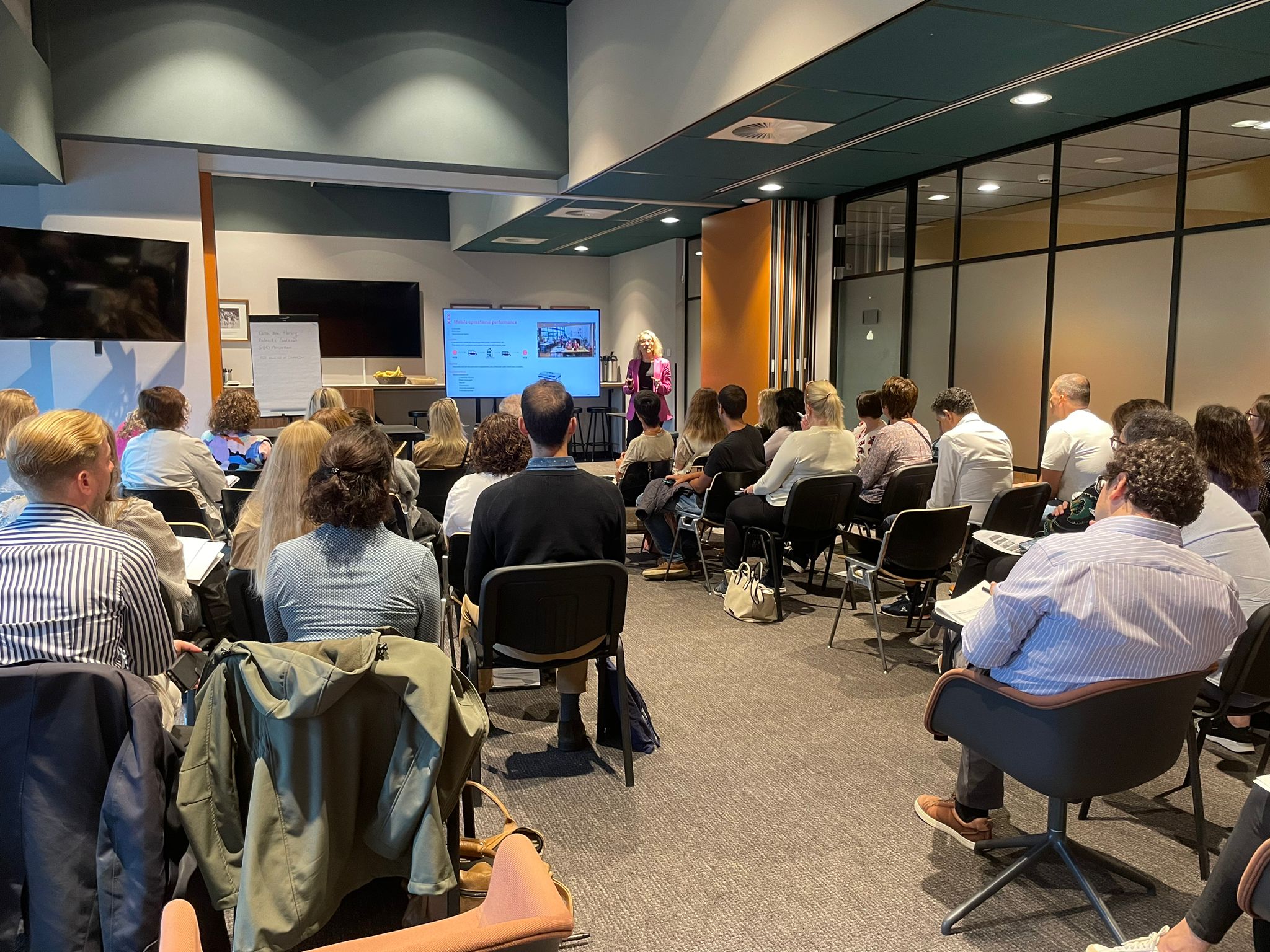A participant talking during one of the presentations on the onsite visit in Amsterdam. -