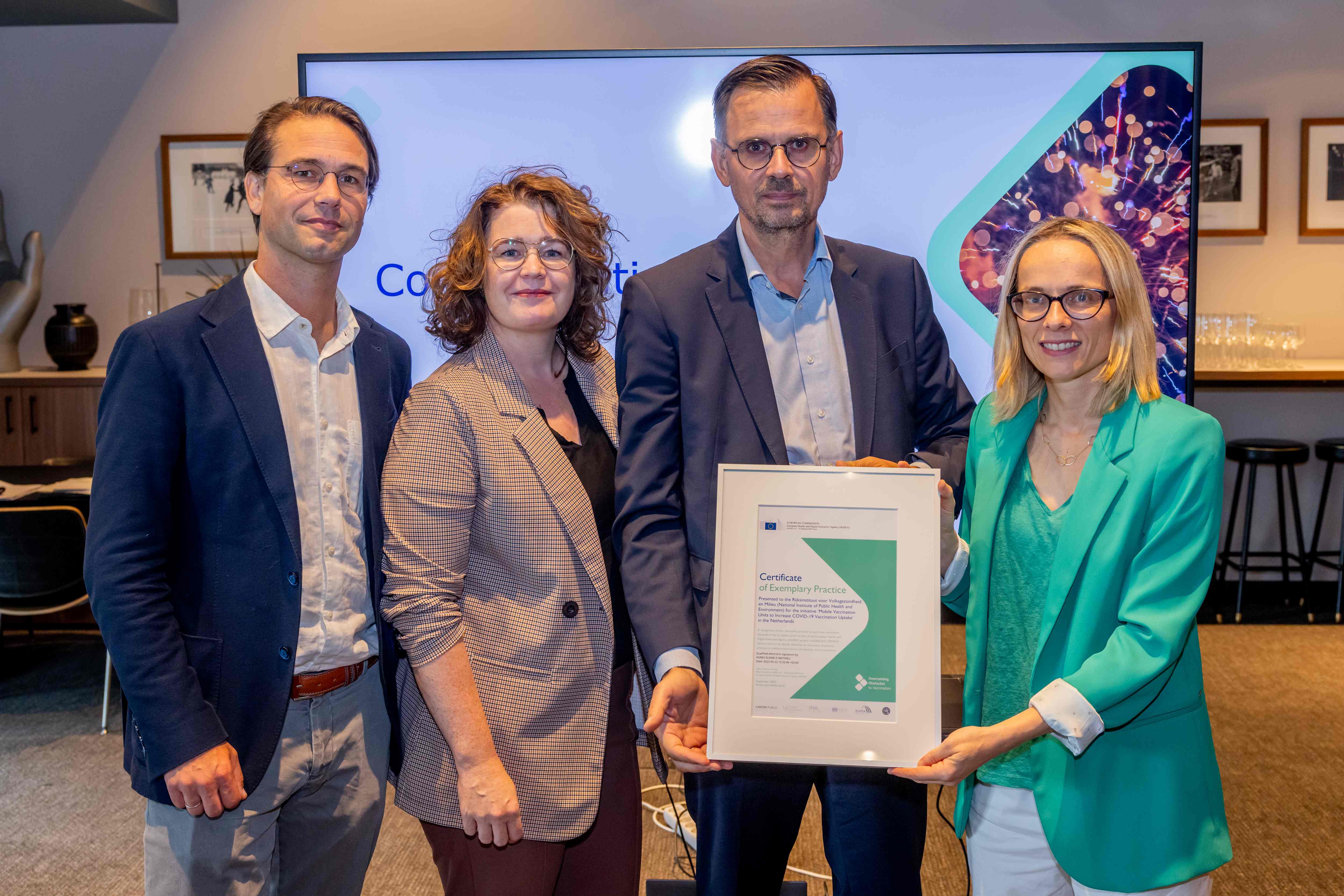 During the visit, the Dutch National Institute of Public Health and Environment (Rijksinstituut voor volksgezondheid en milieu (RIVM)), the Municipal Health Service Amsterdam (GGD Amsterdam) and the Healthcare Insurance Association (GGD GHOR Nederland) were awarded a certificate of outstanding practice from the European Health and Digital Executive Agency (HaDEA).
